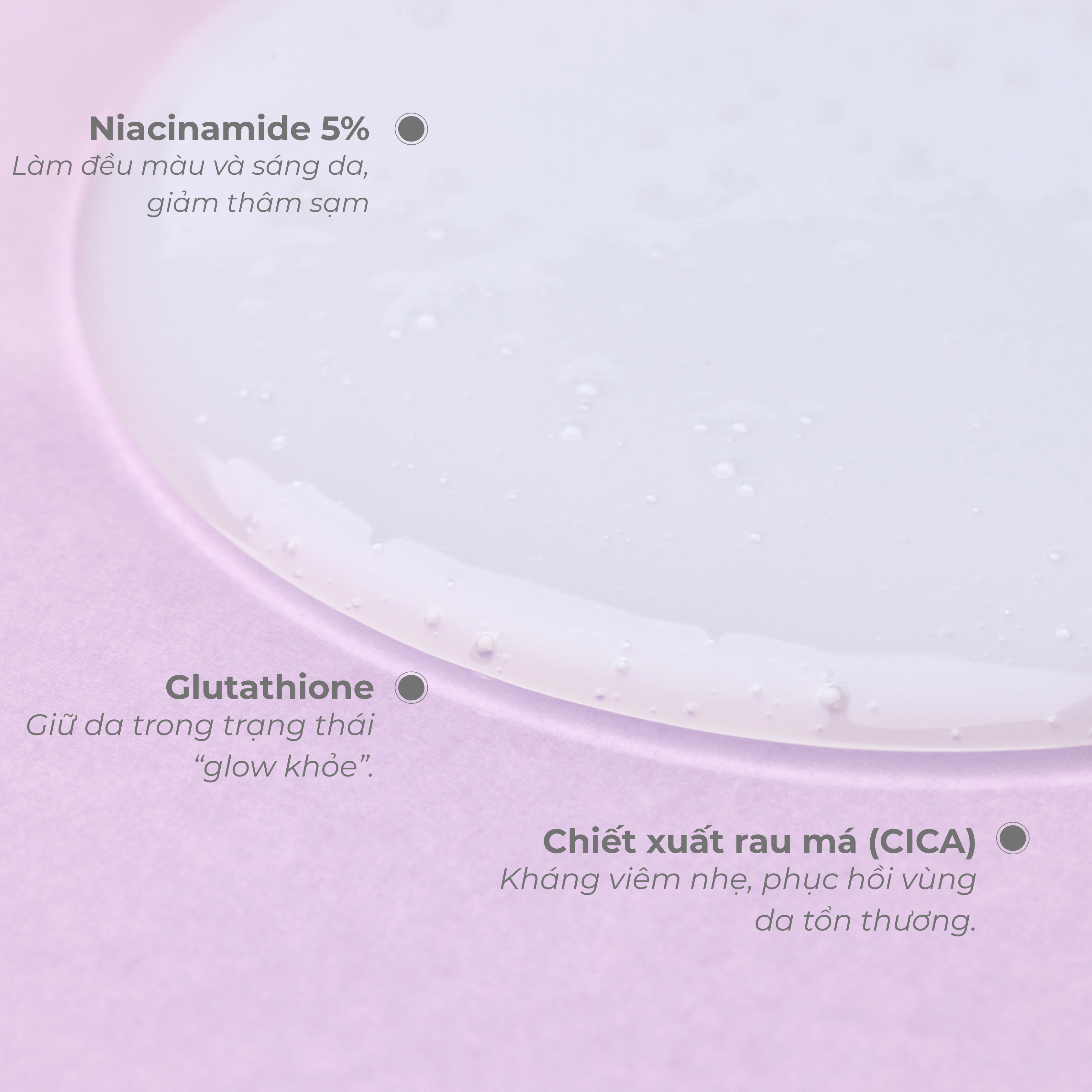 Bẳng thành phần tậng trung làm sáng da dịu nhẹ, hỗ trợ phục hồi da và giúp da giữ ẩm và ổn định.